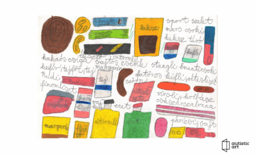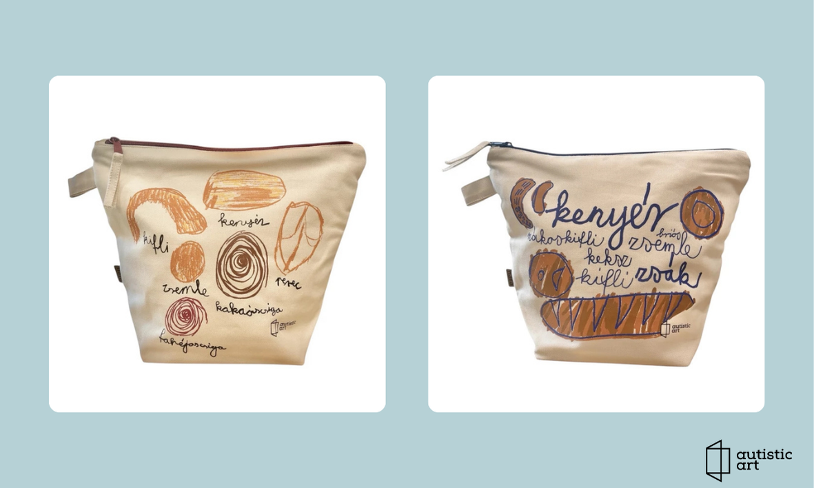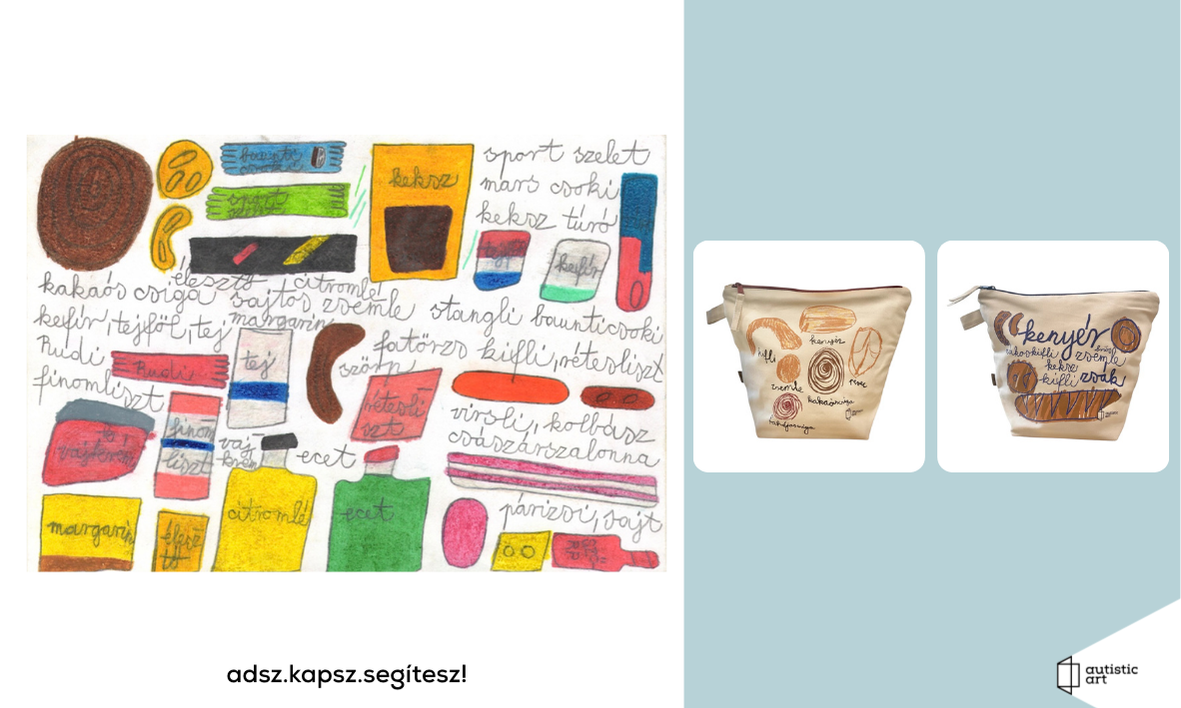 02. Kiss Péter autista fiatal grafikája és 2 féle mintával kenyereszsák