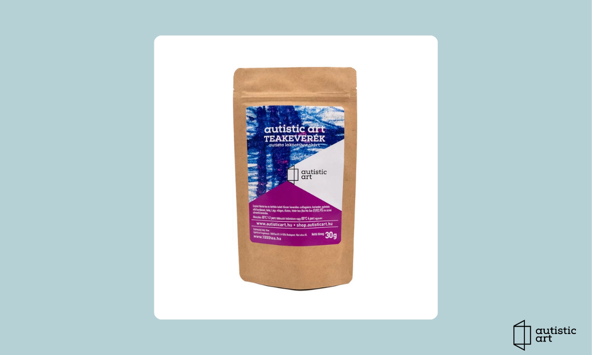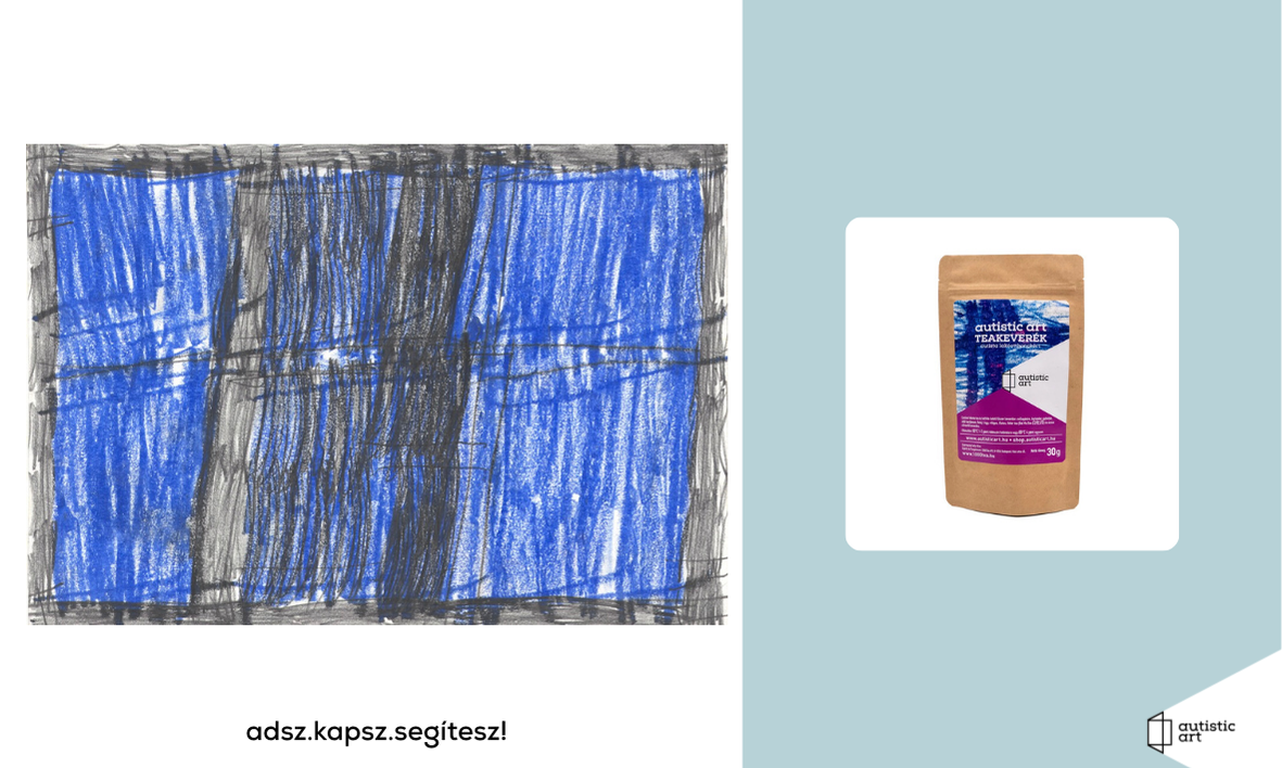 01. Lakatos Renáta autista fiatal grafikája és 3 csomag Autistic Art teakeverék